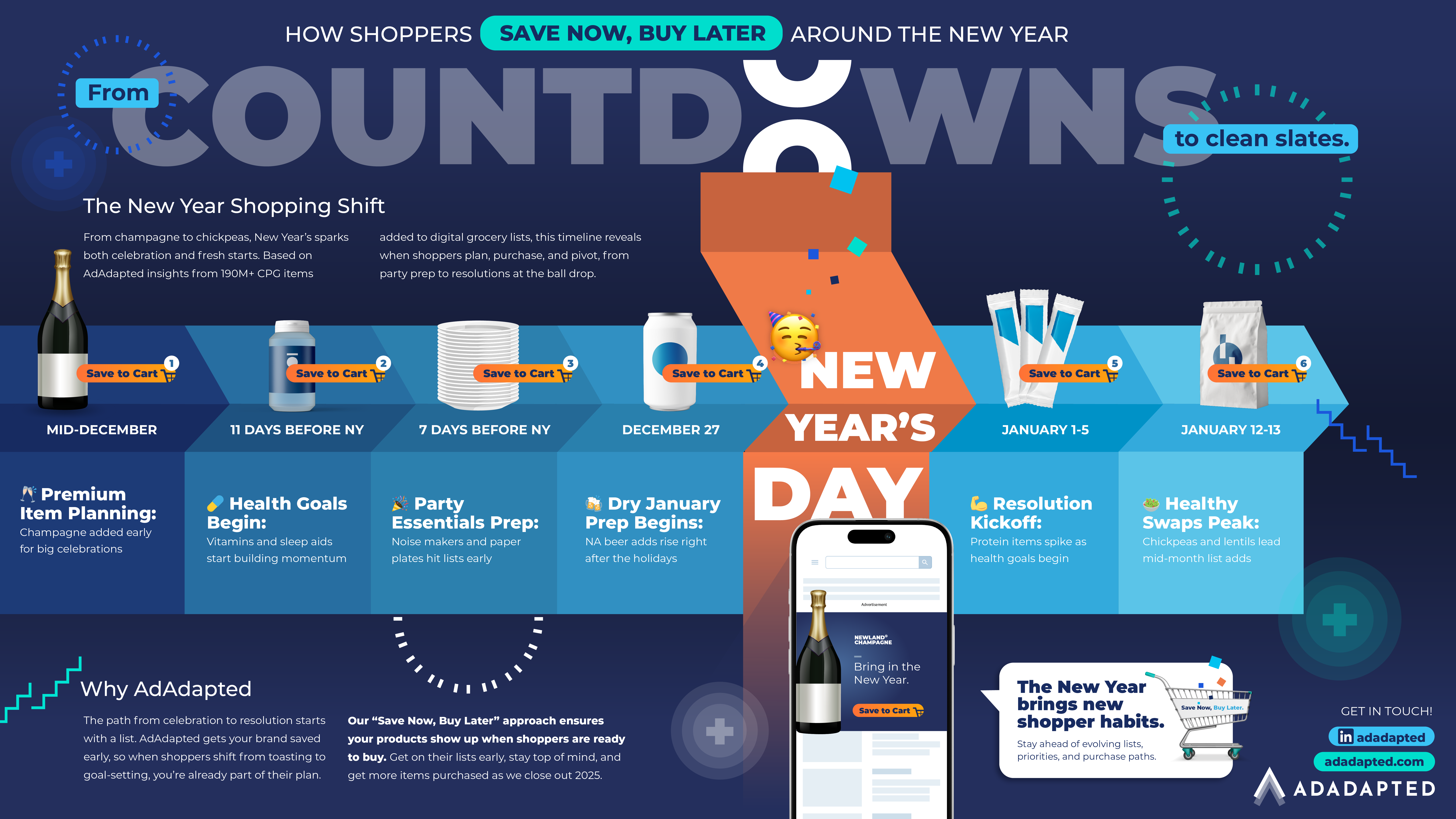 AdAdapted analyzed more than 190 million CPG products added to digital grocery lists to uncover when shoppers start building their baskets for the new year. The result? A data-driven look at how celebration gives way to resolution, and how brands can use these “Save Now, Buy Later” moments to influence purchase decisions before they happen.